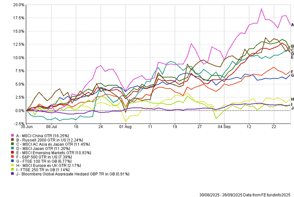 Quarter-to-date returns still paint a broadly positive picture, albeit with some clear divergences. China has led global markets with gains of more than 16% since the end of June, while US small caps and Asia ex-Japan have also delivered double-digit returns. Japan, emerging markets, and the S&P 500 are not far behind. Closer to home, the FTSE 100 has risen around 7–8% on the back of solid earnings, while mid-caps in the FTSE 250 have lagged with only modest gains. Bonds, meanwhile, have added little, reinforcing equities as the asset class of choice in this late-summer rally.