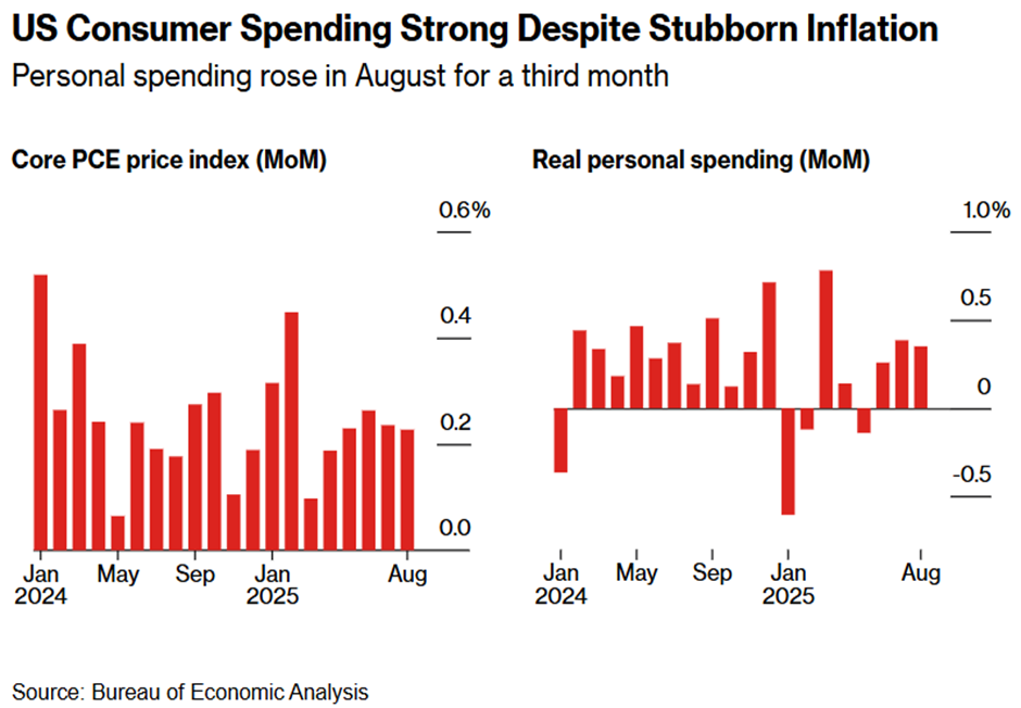 If there was one standout data point last week, it was the strength of US consumer spending. Real personal consumption rose 0.4% in August — the third consecutive monthly gain and double consensus expectations — underlining just how much households are continuing to drive the economy forward. Goods demand, especially discretionary categories such as furnishings, clothing, and recreational equipment, led the way, while services spending grew more moderately. That resilience helped lift Q2 GDP growth to an upwardly revised 3% annualised pace, keeping the ‘soft landing’ narrative very much alive.