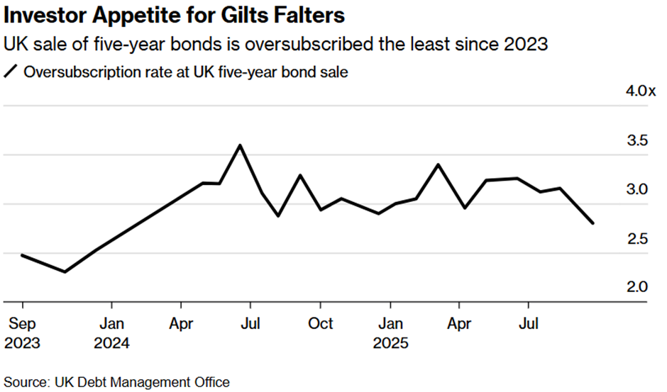 That unease is now showing up directly in the gilt market. Demand at this week’s bond auctions was the weakest in at least two years, with both 5-year and 30-year sales drawing thin order books. The Debt Management Office has already tilted issuance towards shorter maturities to reflect fading appetite from pension funds, so the wobble in shorter-dated auctions is especially notable.