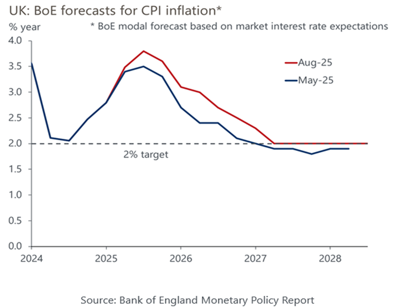 Against a backdrop of shifting global trade winds, attention in the UK turned to monetary policy. The main economic event closer to home was the Bank of England’s closely watched August meeting, which delivered a 25bps rate cut to 4% but only after a knife-edge vote. The initial split saw one member push for a 50bps cut, four for a 25bps cut, and four for no change. Only after a second round of voting, with the 50bps option removed, did a narrow 5-4 majority emerge in favour of easing. The hawkish camp, including Greene, Lombardelli, Pill and Mann, argued that recent upside surprises in food and fuel prices risked embedding higher inflation expectations, despite evidence that wage growth is cooling and labour market slack is building. The doves pointed to weak activity, falling pay settlements, and the risk of recession as justification for loosening policy.