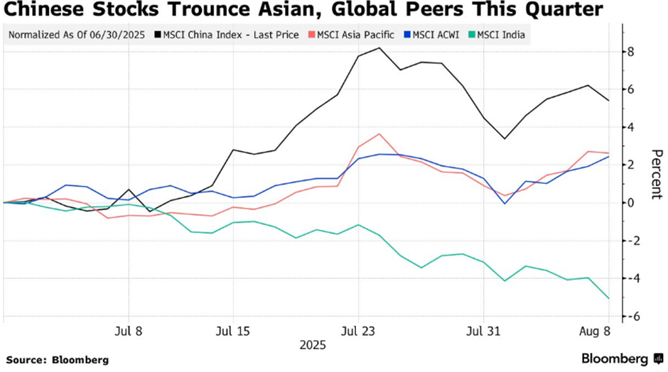 The selective targeting has amplified concerns already hanging over India: stretched valuations, moderating earnings growth, and the possibility that tariffs will blunt its ambitions to be the world’s next manufacturing hub. Foreign investors withdrew $3 billion from Indian stocks in July, the sharpest monthly outflow since February, while domestic institutions have had to step in with heavy buying to support prices. By contrast, Chinese equities have drawn renewed interest. Policy easing, the government’s ‘anti-involution’ push, and a string of AI breakthroughs have added momentum, all at far more modest valuations. The MSCI China index trades at less than 12x forward earnings versus over 21x for India.