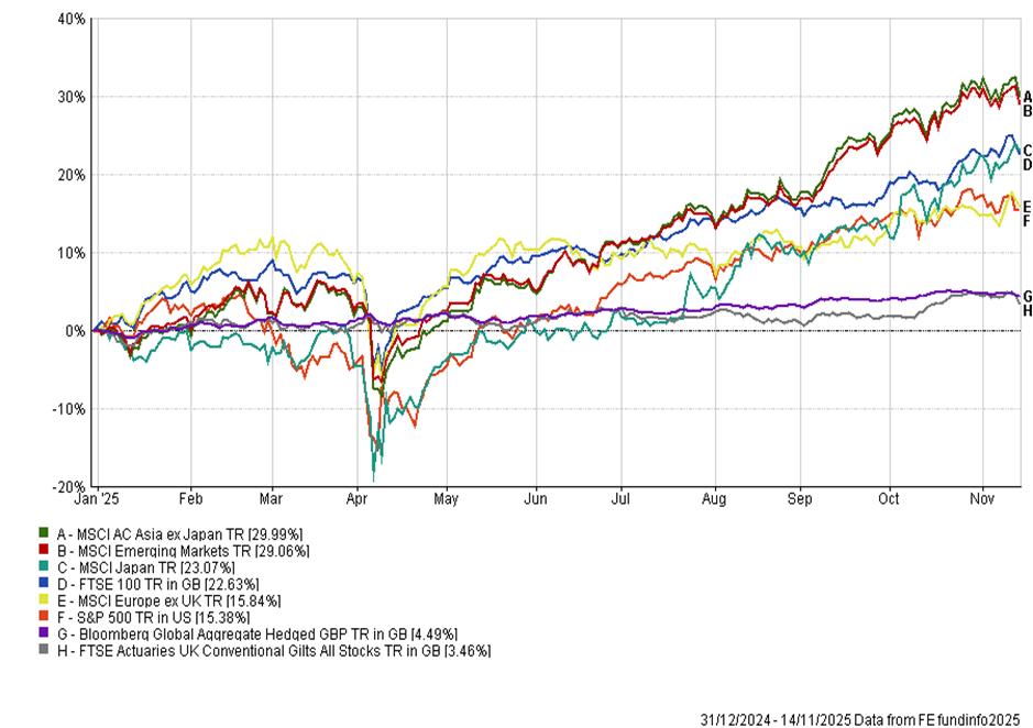 Yet when you step back from the noise of the week, the bigger picture is far less dramatic. Global equity markets remain comfortably positive year-to-date, and leadership remains broadly consistent with the themes that have defined 2023. Asia ex-Japan and Emerging Markets continue to sit near the top of the leaderboard. Japan and Europe have delivered steady, mid-teens gains. And the US — despite the volatility in big tech — remains up by double digits, supported by strong earnings, resilient employment, and the enduring pull of AI-related growth.