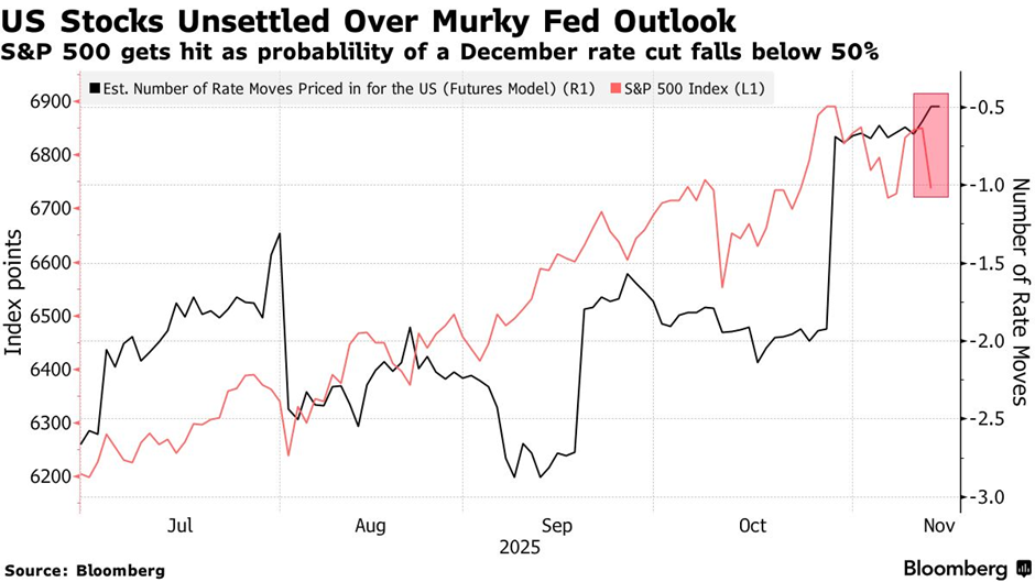 If there was a single thread running through last week’s volatility, it was the market’s growing discomfort with the Federal Reserve’s recent tone. The probability of a December rate cut has fallen sharply, with markets now pricing only a roughly even chance after sitting well above 70% earlier in the week and over 90% a month ago. Several Fed officials have questioned the need for further easing. With official data missing during the shutdown, investors are left to debate whether the Fed is responding to stubborn inflation or cooling labour demand.
