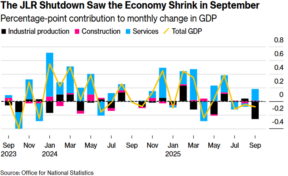The UK economy stalled almost entirely in the third quarter, with GDP rising by just 0.1%. Most of that disappointment stemmed from September’s contraction, when the Jaguar Land Rover cyberattack led to a five-week shutdown of the country’s largest automaker. Car production fell by almost 30%, marking its worst month since the pandemic, and dragging manufacturing and industrial output sharply lower. Services held up reasonably well, but not enough to offset the damage.