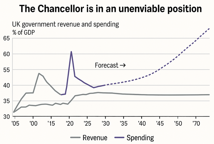 I am not a political animal, but the uncomfortable truth laid bare by the fiscal charts is that the UK’s problem is not revenue, it’s spending. Successive governments have allowed the structural cost base of the state to drift higher — driven by demographics, welfare, the NHS, pensions, and debt servicing — while hoping that incremental tax tweaks could paper over the gap. That simply doesn’t work anymore. Spending is on a steep, long-term upward trajectory; revenues are already close to their practical ceiling