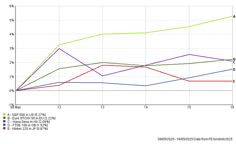 Finally, geopolitical events had mixed effects: the India–Pakistan conflict pause lifted South Asian markets, while tentative Russia–Ukraine talks briefly buoyed European defence stocks. Overall, the week saw a synchronised global upswing, with a few pockets of caution.
