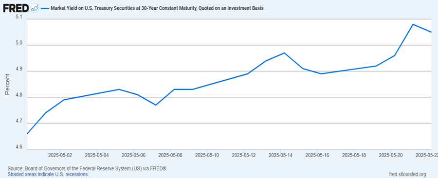 Earlier last week, markets were looking relatively stable, but that calm gave way  with confirmation that Trump’s ‘Big Beautiful Bill’, a sweeping package of tax cuts, had cleared the House. While the headline wasn’t surprising, the bond market’s response was striking. A weak 20-year Treasury auction sent yields sharply higher as investors reassessed the implications of an even looser fiscal policy layered on top of an already strained debt outlook. Equities quickly followed, with rising real yields tightening financial conditions and placing renewed pressure on valuations.