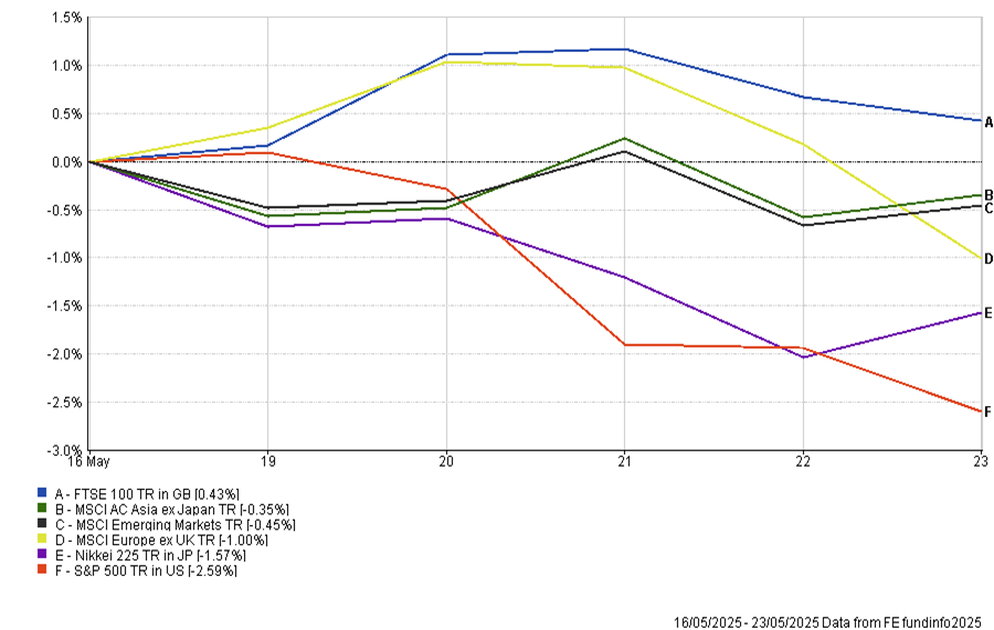 A graph of different colored lines  AI-generated content may be incorrect.The combination of narratives last week, has brought back into focus a set of risks that markets had, until recently, been willing to look past. The shift higher in Japanese bond yields also spooked investors in that market. The UK was left as one of the few markets higher last week, with the FTSE 100 eking out a small weekly gain of 0.43% – likely by nature of staying out of global headlines!