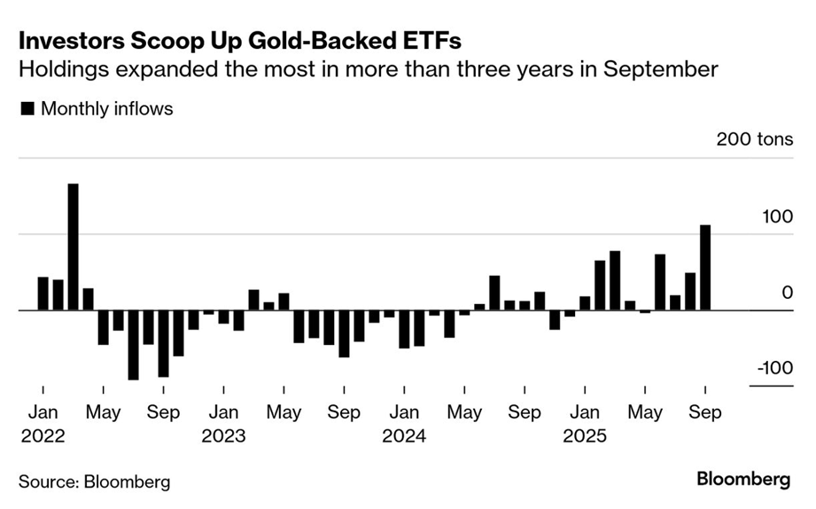 Bitcoin set yet another all-time high over the weekend, climbing to around $125,000 as the broader risk rally extended into digital assets. The world’s largest cryptocurrency has risen by more than 30% this year, aided by renewed inflows into Bitcoin-linked ETFs and growing speculation that the US government shutdown will ultimately erode confidence in the dollar.