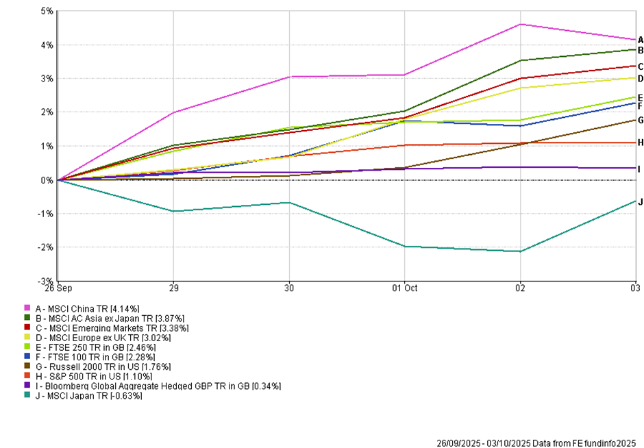 It was another week of resilience, the latest in a long series that continues to defy the sceptics. China extended its rebound, with Europe joining the party, posting gains of more than 3%. The UK also had a decent week, as the Labour Party conference passed without incident. Only Japan lagged, which is striking given its strong performance for most of the year. The tone elsewhere was quietly upbeat. Bond yields edged lower, credit spreads stayed tight, and volatility remains subdued.