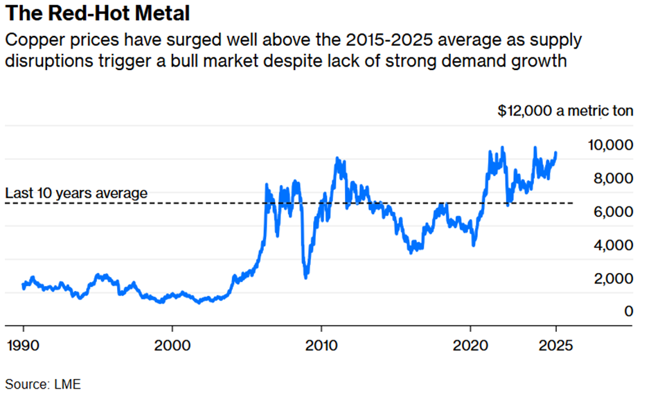 While politics and policy have driven gold and Bitcoin, copper’s message is more grounded in the real economy, and it’s a fascinating mix of near-term disruption and long-term promise. Prices have been firming again, hovering near $10,000 a tonne, supported by a series of supply shocks that have crimped output from some of the world’s largest mines. Flooding at the Congo’s Kamoa-Kakula mine, an accident at Chile’s El Teniente, unrest in Peru, and most dramatically, the September disaster at Indonesia’s Grasberg mine (the world’s second-largest producer) have all combined to remove significant tonnage from the market. Output isn’t expected to return to normal until at least 2027.