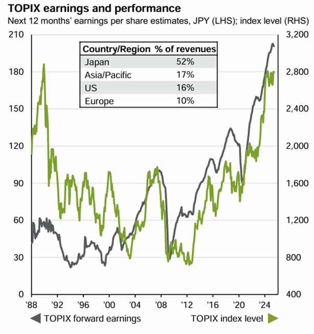 Still, equity markets remain firm. The TOPIX has risen alongside earnings with valuations undemanding by global standards, and corporate reform continues to underpin margins and buybacks. The long-term structural story of better governance, stronger returns on equity (ROEs), and greater foreign interest remains intact but is less enticing now. A fragile macroeconomic environment, fading global trade, and a central bank stuck between the fear of volatility and the desire for normalisation all point to a market that may be consolidating at these levels for the time being. That said, Japan’s transformation story isn’t over, although investors may need to be patient before the next leg higher.