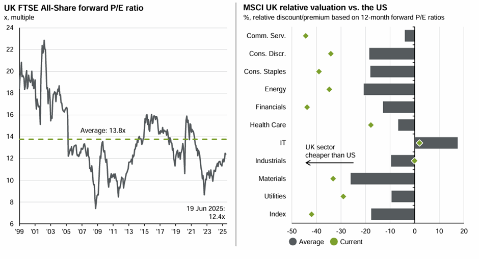 The chart below, courtesy of J.P. Morgan, makes the point clear. The UK FTSE All-Share is trading at just 12.4x forward earnings, well below its long-term average of 13.8x. Relative to the US, the UK remains on a steep discount across almost every sector. Consumer discretionary, materials, and utilities all trade at valuation gaps of over 30%.