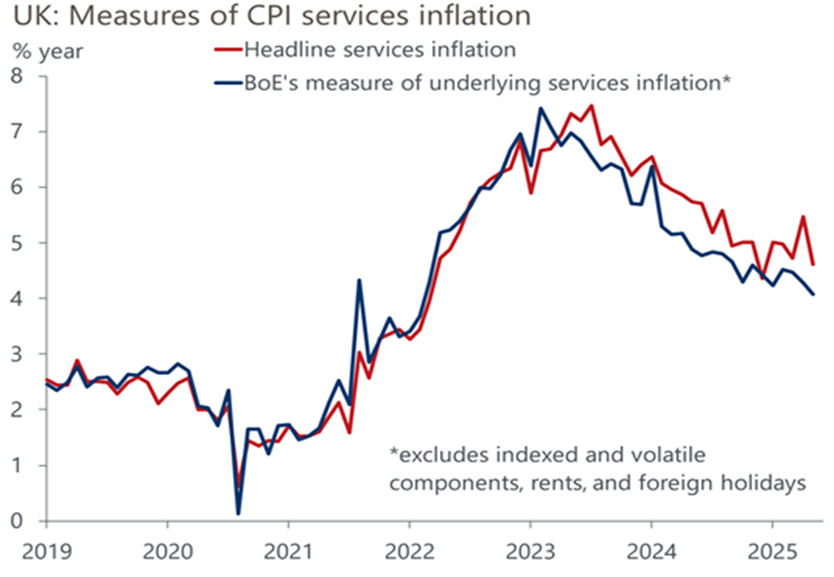 The Bank of England held rates steady at 4.25% this week, as widely expected, but the tone of the minutes and the split vote (6 in favour of holding, 3 for cutting) made clear that the bias is shifting towards easing. After months of hawkish hesitation, the MPC now seems more confident that the labour market is softening and that wage pressures are abating. The acceleration in job losses across lower-paid sectors, particularly those hit hardest by recent hikes in National Insurance Contributions and the National Living Wage, is ringing alarm bells. With vacancies falling and a rise in underemployment, the Bank now sees ‘clearer evidence’ of slack re-emerging. While headline inflation ticked down only marginally in May, the Bank’s preferred gauge of services inflation, stripped of airfares and other volatile components, continued its descent, reaching its lowest level in over three years.